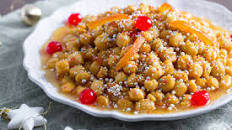 misculatele buone in modo ca e struffole se cummogliene e miele. Recavatele dint’a nu piatto largo e tunno inumidito cu l’acqua. Date a stu cumposto a forma e na torta e decuratelo cu e cunfettielle culurate e cu a frutta candita a piacere.